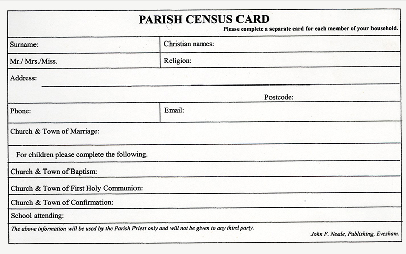 Census cards provide all the information required by the parish without undue intrusion into parishioners’ private lives. A5. Pack of 50.